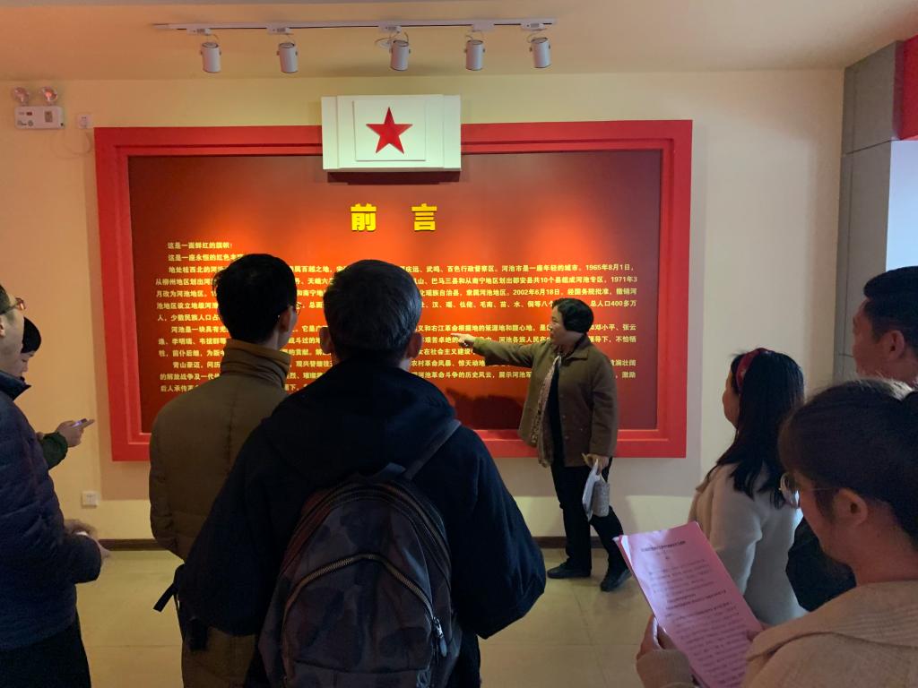 据了解,河池市是自治区爱国主义教育基地。纪念馆对外开放固定展厅有“红色丰碑——河池革命斗争史陈列展”和河池英烈谱。在本次活动中,全体教职工学习了解百余件大革命、抗日战争、解放战争等时期革命文物,以及参观百历史图片。之后,大家积极讨论学习心得,对党、党史有了更为深入的理解。此外,还有近300平方米的临时展厅向观众和游客开放,展览内容不定期更换。