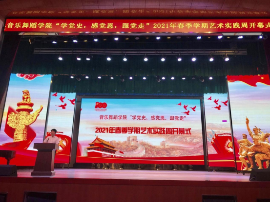 院长曾宏华致开幕词并宣布艺术实践周开幕。他要求学生们要“学党史、感党恩、跟党走”。他还通过近期我院师生在各项艺术比赛中所获得的成绩勉励在场的同学们。并强调,艺术实践周是学院艺术实践教学的浓缩,也是办学成果的呈现,是全体同学施展才艺的舞台,更是同学们相互学习的舞台。希望同学们在比赛中讲风格、讲友谊,互相帮助,大胆竞演。
