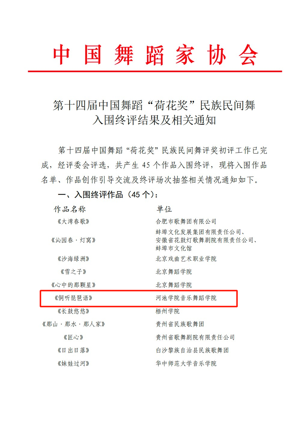 近日,第十四届中国舞蹈“荷花奖”民族民间舞评奖公布了45个入围终评作品名单,我校必赢3003no1线路检测中心原创舞蹈作品《侗听琵琶语》成功入选终评作品名单中。这是我校舞蹈学专业建设的一个重大突破,具有非凡的里程碑意义。