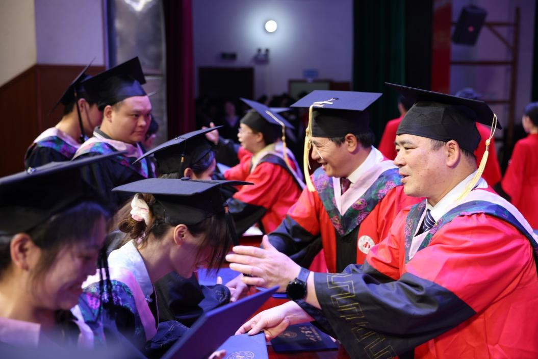 接下来,学院领导班子成员为毕业生们正冠拨穗、授予学士学位。毕业生们手捧学位证书,身着学士服,人生进入了新的阶段。在场师生一起见证学生们完成学业的时刻,掌声和欢呼声不断响起。