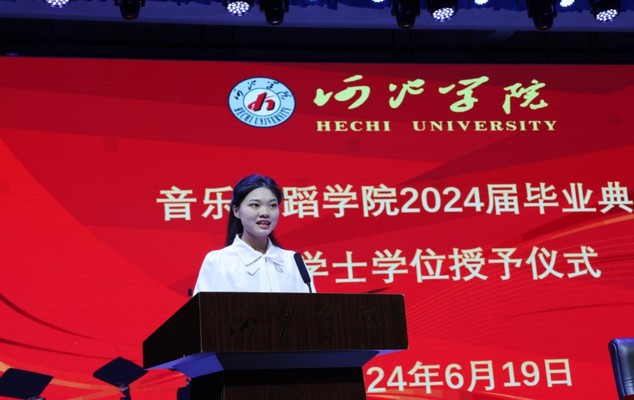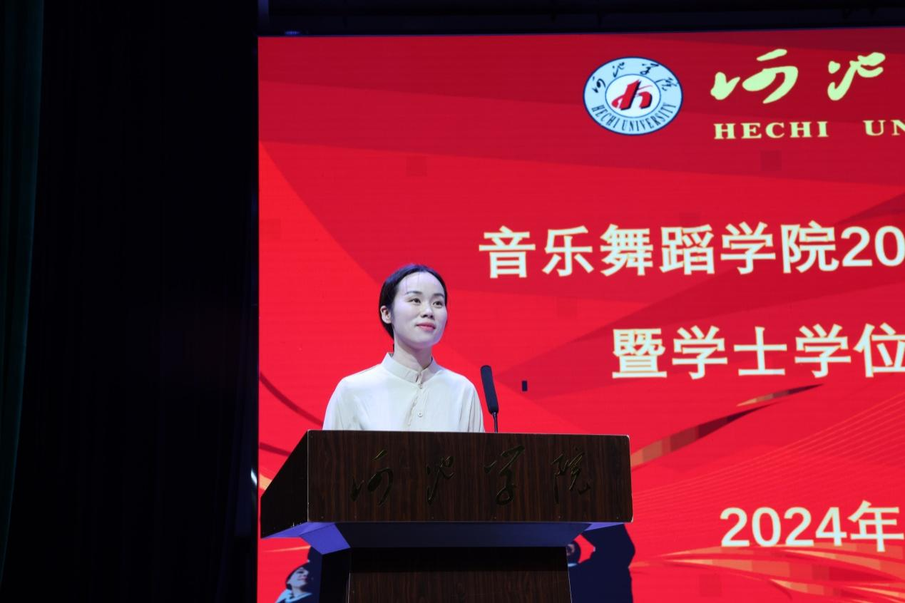 毕业生代表吴若嫔发言,回顾了大学四年的成长历程,并展望了未来的发展和挑战。在校生代表杨光钰同学向毕业生送上最真挚的祝福,表达了对毕业生们的祝贺和未来的期待。教师代表刘玉兰老师则鼓励毕业生们在未来道路上坚定信念、追求卓越,保持学习进步和积极向上的态度。