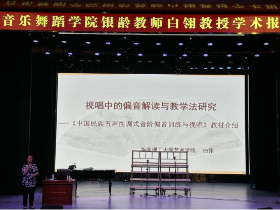 4月19日下午,必赢3003no1线路检测中心在表演厅举办《视唱中的偏音解读与教学法研究——<中国民族五声性调式音阶偏音训练与视唱>教材介绍》专题讲座,主讲人为华南理工大学艺术学院驻我校银龄教师白翎教授。学院领导及全体教师和音乐专业学生均到场聆听讲座。