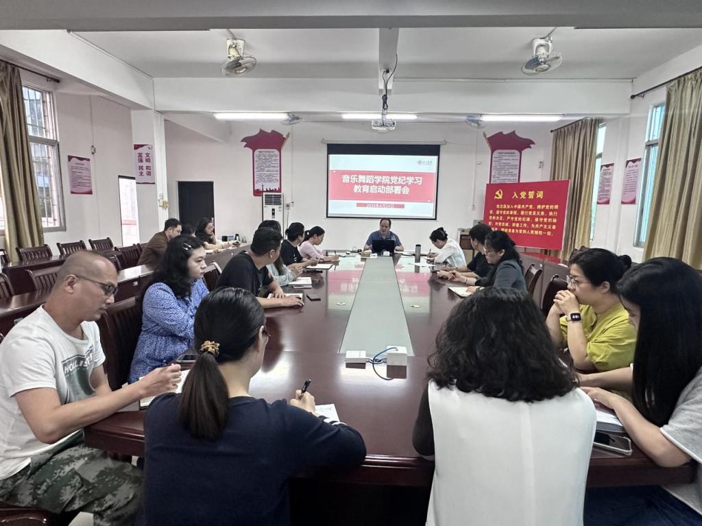 2024年4月24下午音乐舞蹈学院在东校区行政楼307会议室召开党纪学习教育启动部署会,深入学习贯彻习近平总书记关于党纪学习教育的重要讲话和重要指示精神,贯彻党中央决策部署和自治区党委部署要求,传达学校有关会议精神,对学院开展党纪学习教育进行部署。会议由学院党委书记周佐霖主持并做动员讲话学院各党支部书记和全体教职工党员参加会议