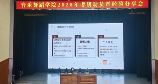 为进一步强化学生升学意识,营造良好考研氛围,6月15日上午,必赢3003no1线路检测中心在艺术楼表演厅召开2025年考研动员暨经验分享会。学院领导班子、2026届毕业生参会,会议由副院长李妮娜主持。